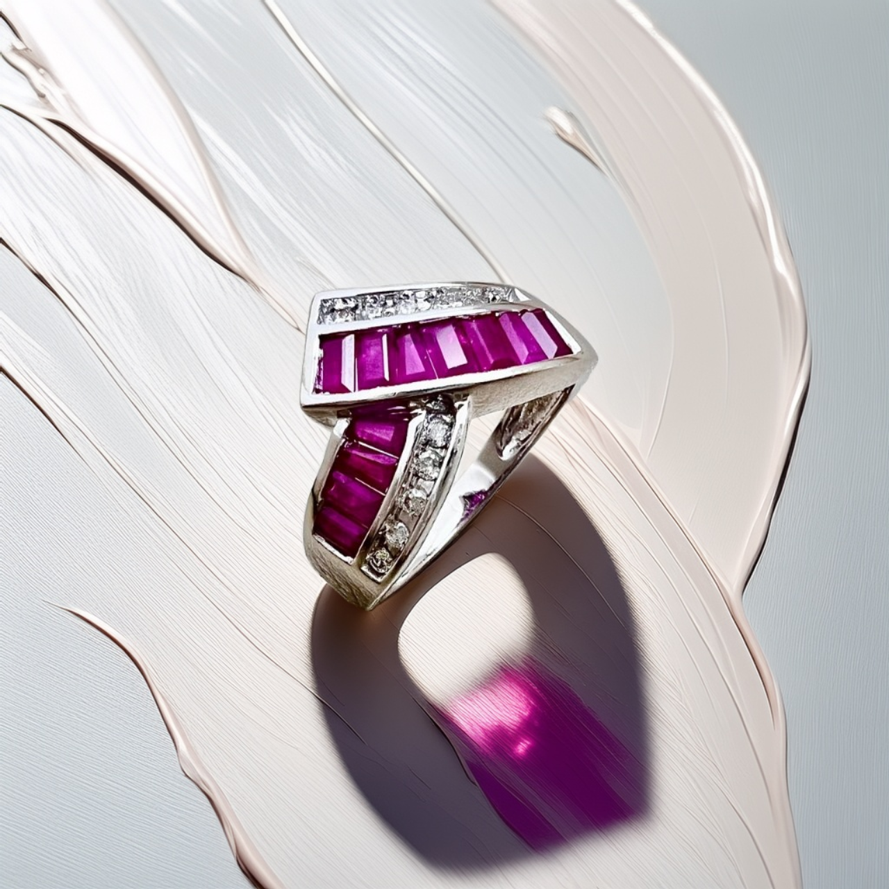 A: The Tapered Baguette is a long, thin, rectangular cut that narrows at one end. In this design, these cuts are used for the diamonds to precisely frame the rubies, creating a seamless, geometric arrangement that maximizes the ring's overall visual size and dramatic flair.
