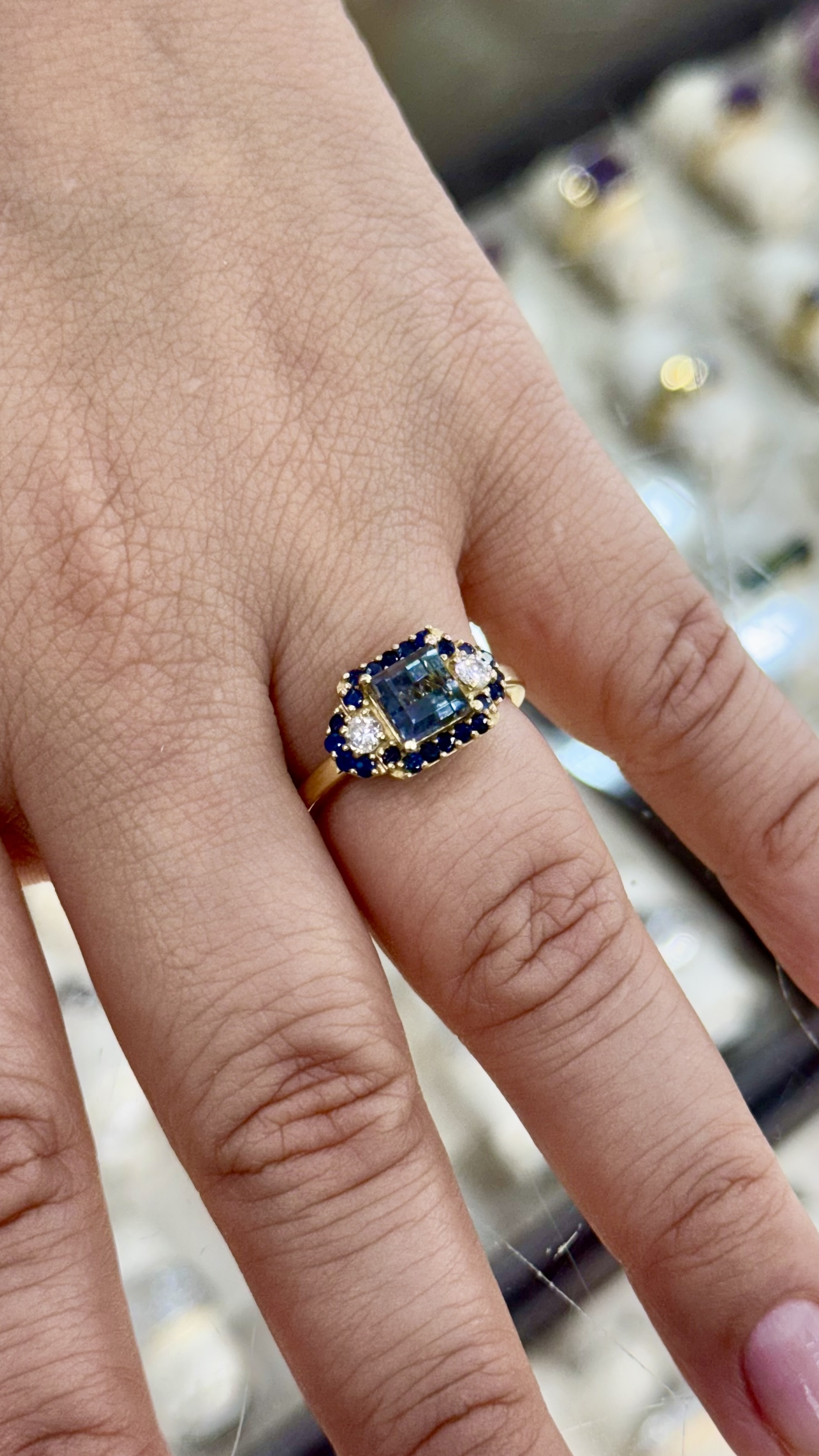 This tourmaline ring can be worn as a statement ring or a unique engagement ring! The combination of diamonds and sapphires compliment the center tourmaline. The setting is low profile and would require a concave wedding band, but nonethless it is a unique ring!