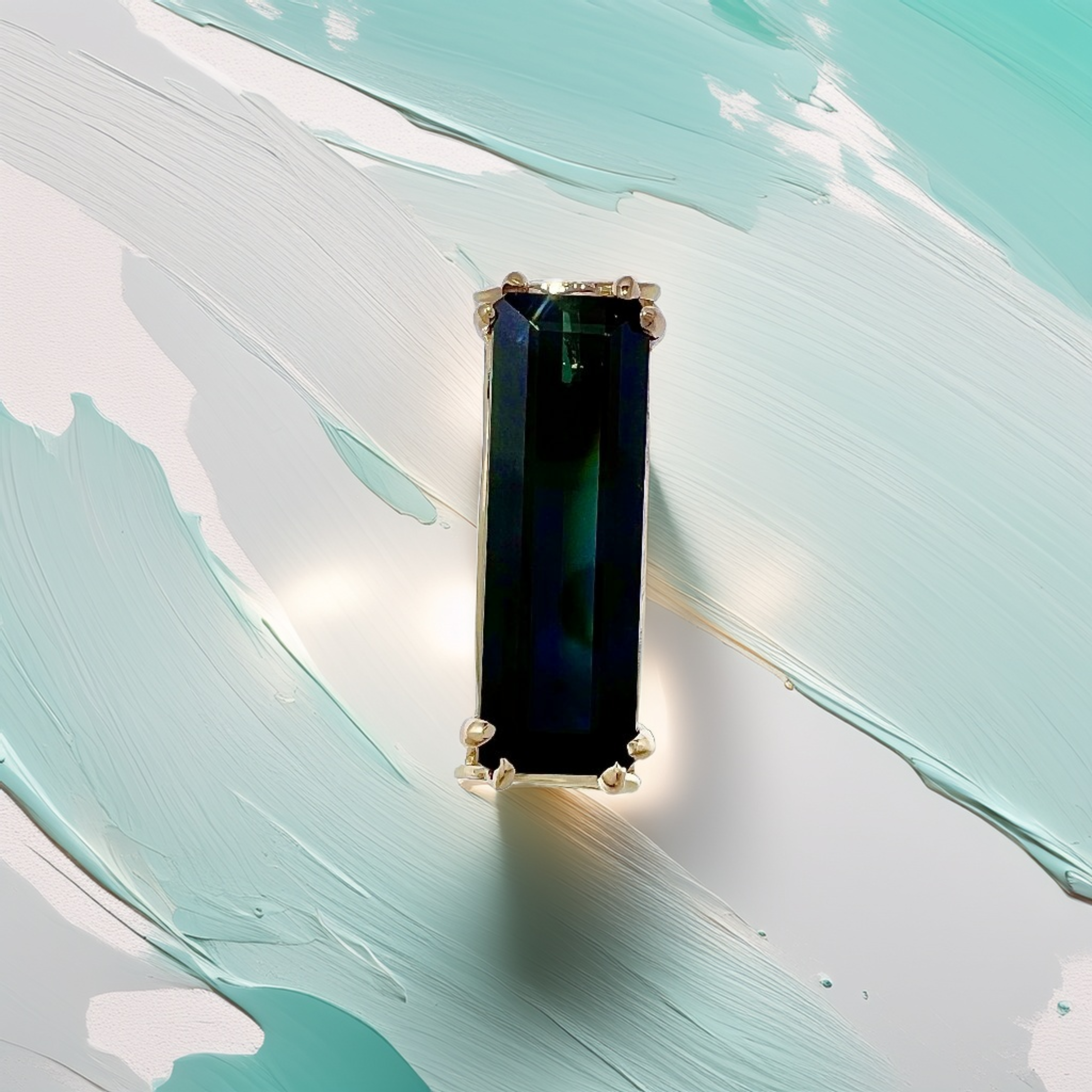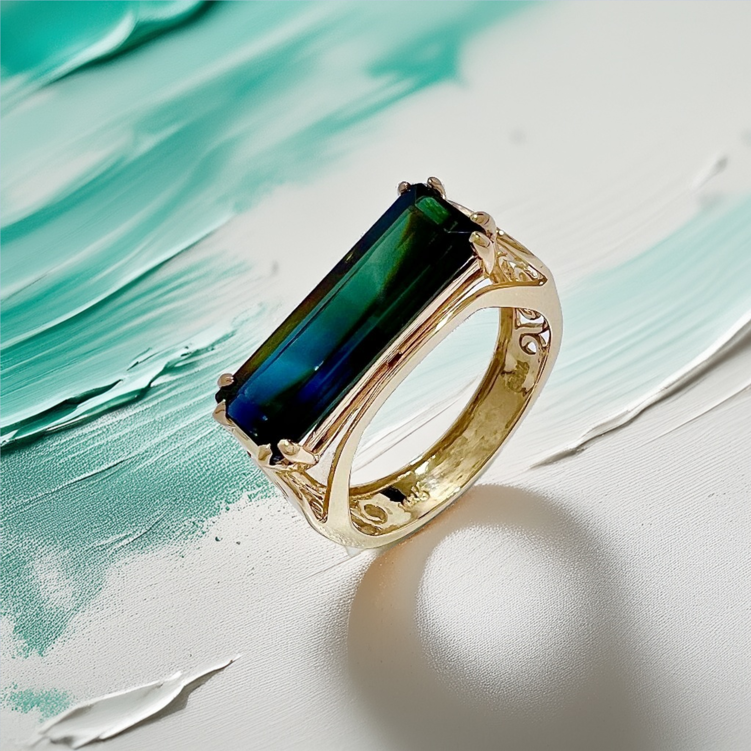 Discover the mesmerizing depth of the Blue-Green Tourmaline Ring, a piece that captures the rare beauty of the ocean's most vibrant hues. This magnificent ring showcases a natural Blue Green Tourmaline gemstone (often referred to as Teal Tourmaline or Indicolite), known for its distinct color shift and captivating brilliance.