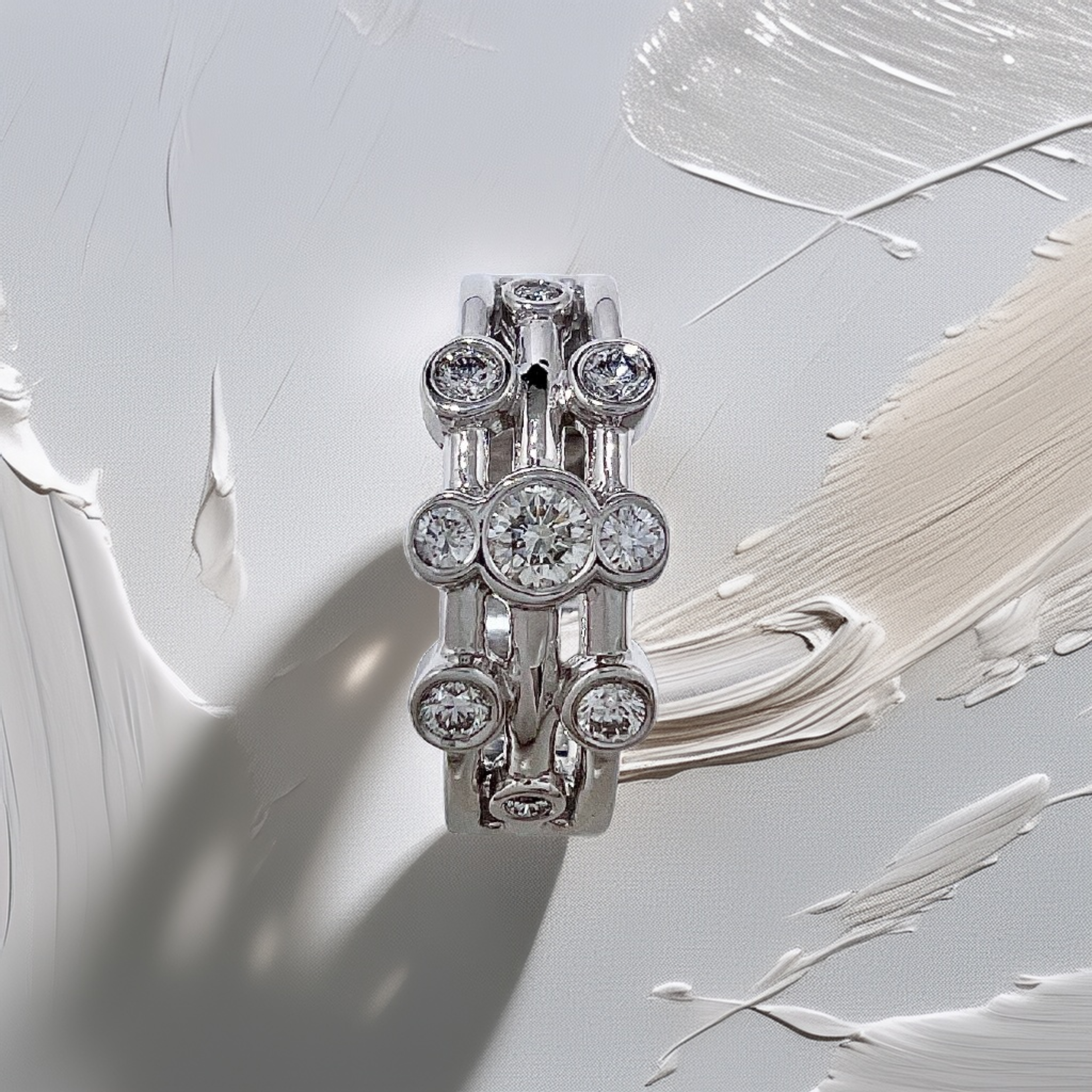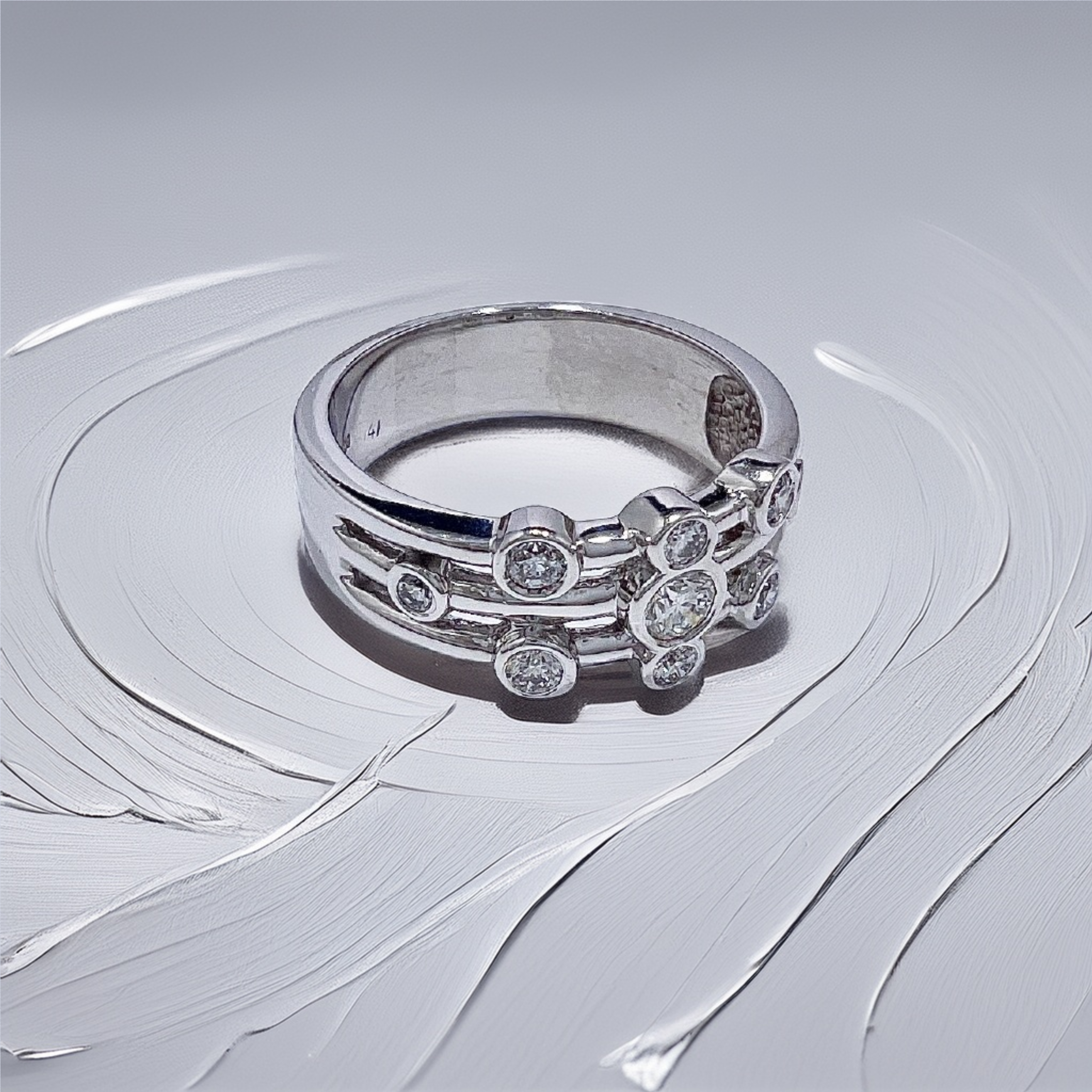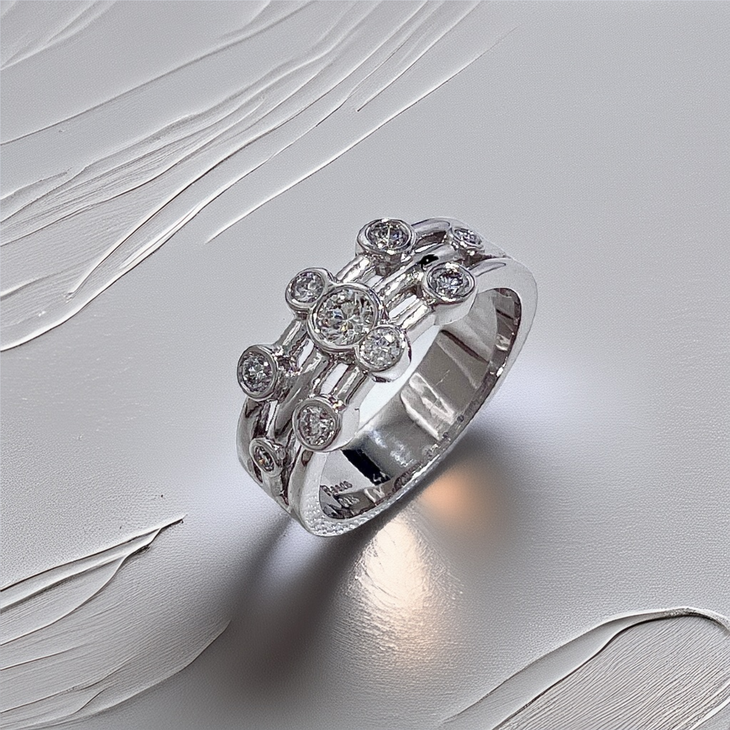 Elevate your collection with the playful sophistication of our 14K White Gold Bubble Diamond Ring. This contemporary ring features a distinctive, captivating "bubble" design, where varied sizes of brilliant diamonds appear to float across the band.