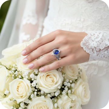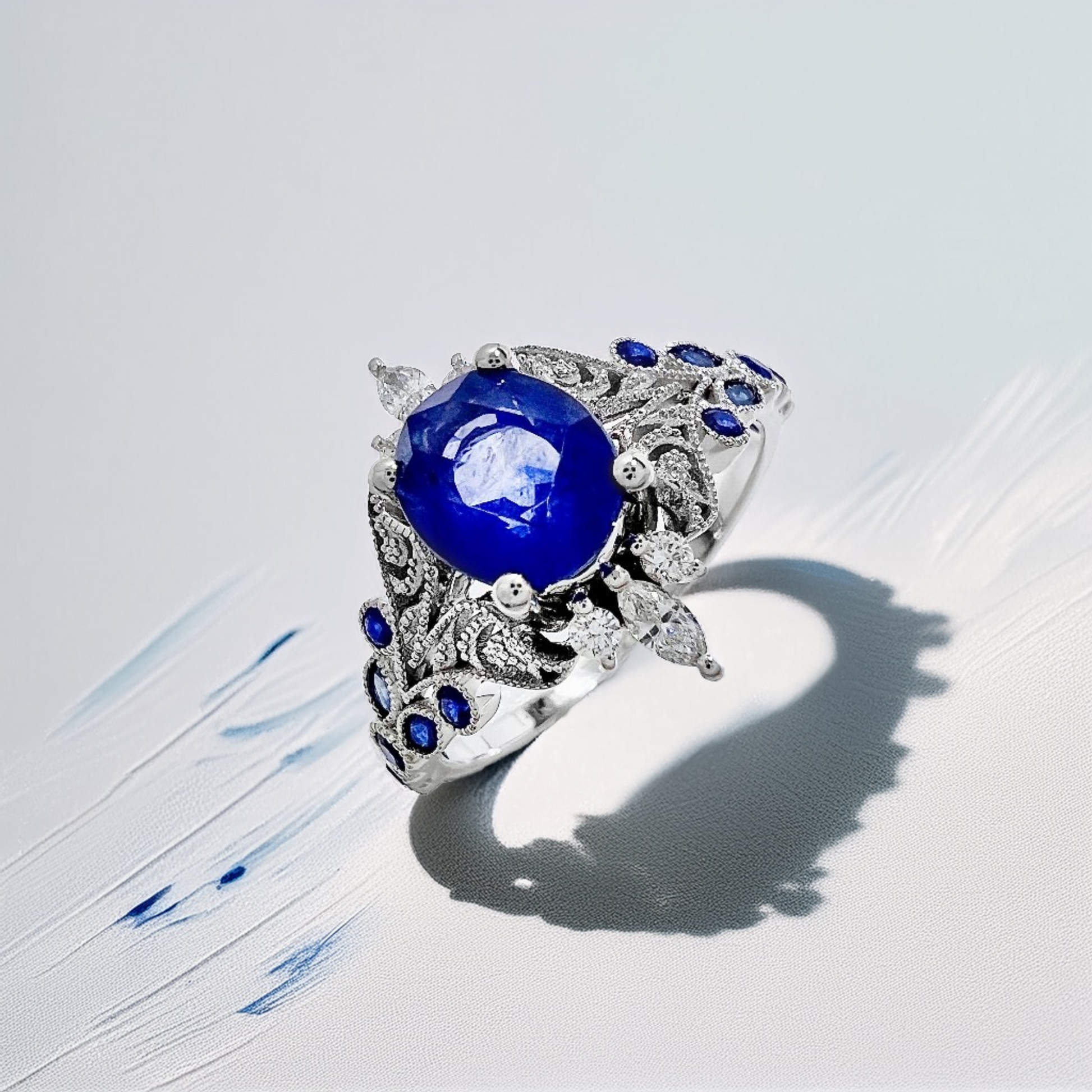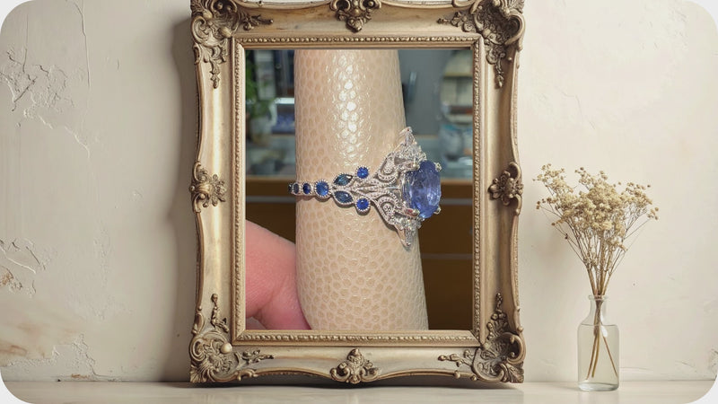 This oval blue sapphire and diamond ring is defined by balance, proportion, and quiet detail. At its center sits a 1.55-carat oval-cut sapphire, chosen for its depth of color and softened shape. The oval cut allows the sapphire to reflect light evenly, giving the stone a calm brilliance that feels refined rather than bold. Surrounding it, marquise-cut diamonds form a vintage-inspired setting that adds structure and subtle sparkle without drawing attention away from the sapphire itself.