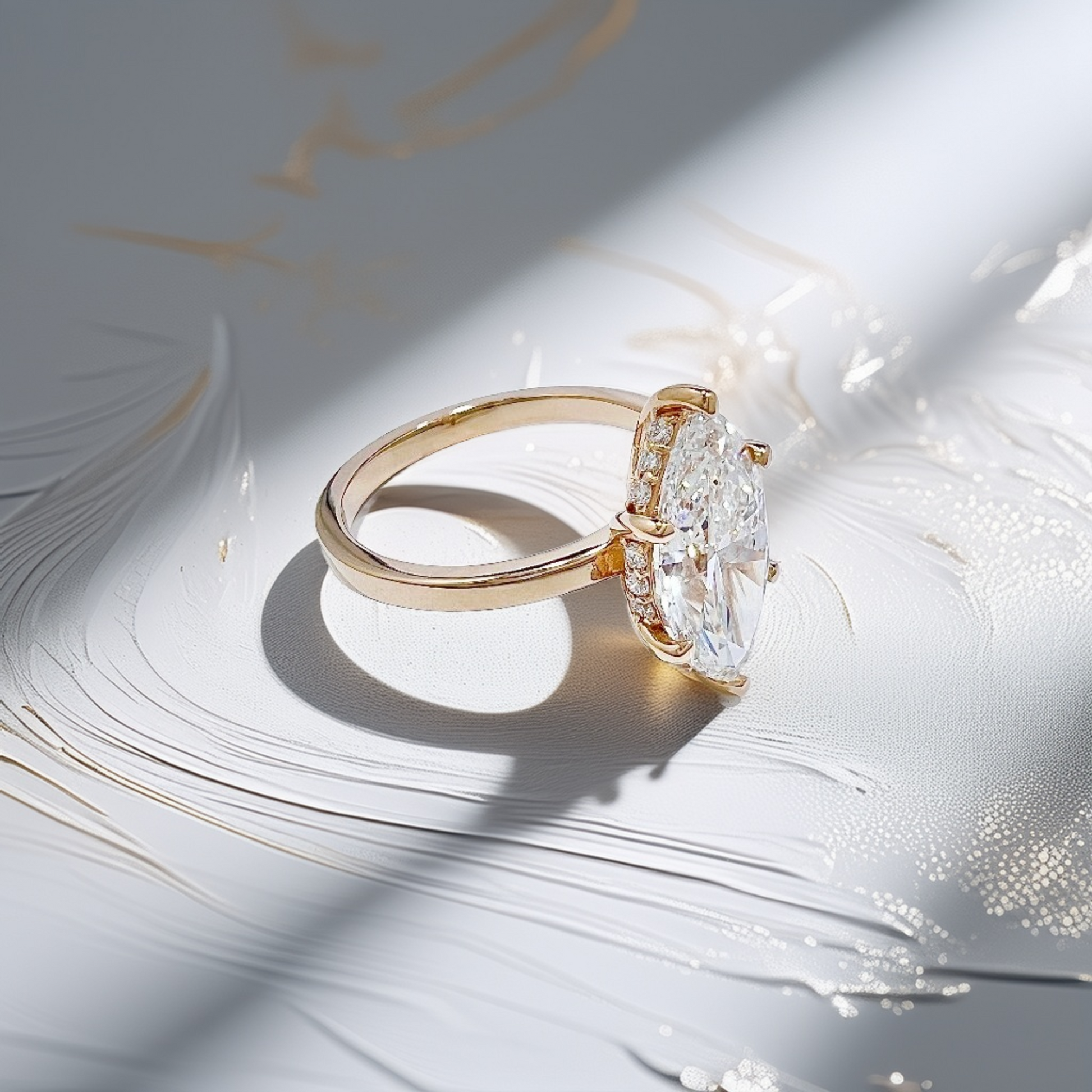 The marquise cut is all movement—elongated, directional, and unmistakably fluid. Its tapered points draw the eye outward, creating a sense of lift and quiet drama without excess. Light travels differently here, stretching across the surface rather than settling in one place.