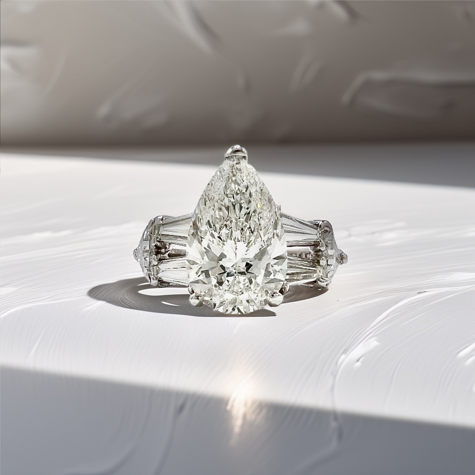 The design combines a 3 carat pear-shaped lab diamond with tapered baguette and triangle-cut natural diamonds, creating a mix of soft curves, clean lines, and sharp angles. -