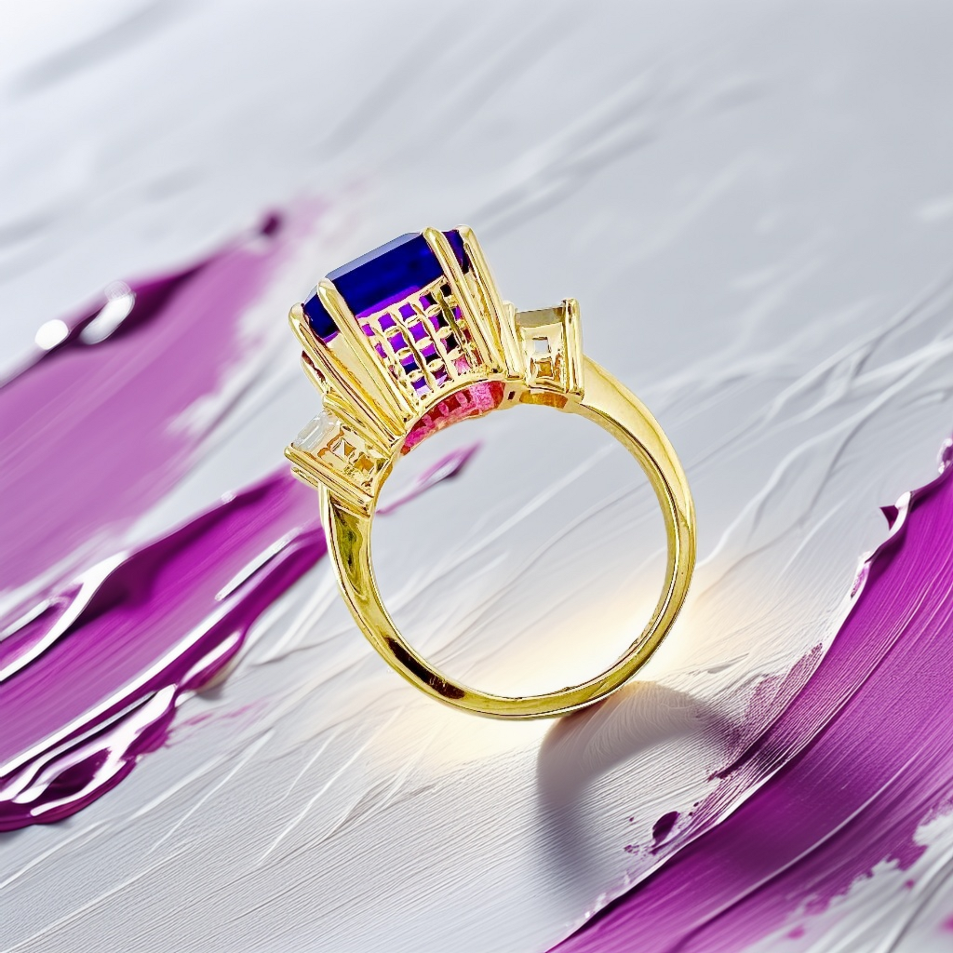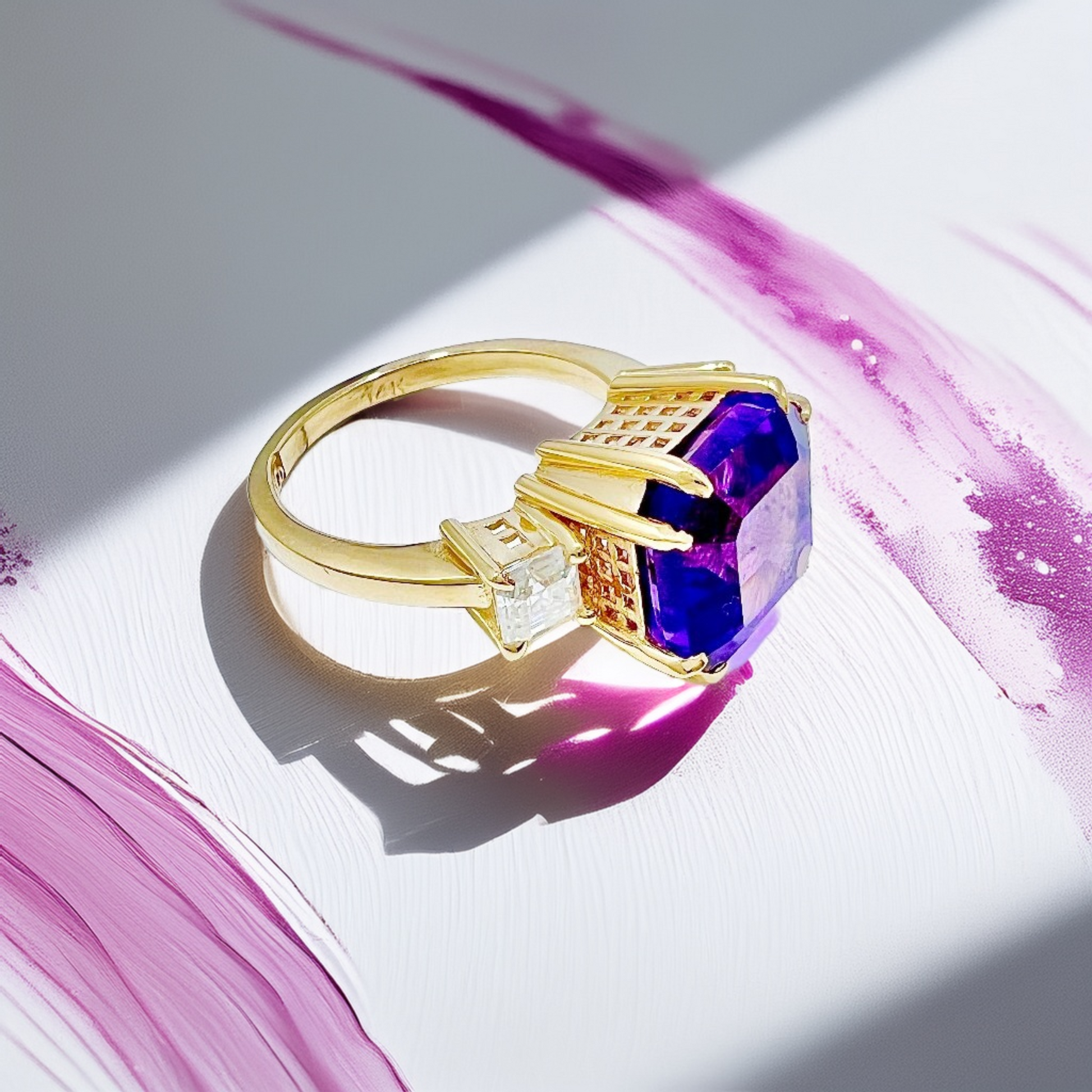 The 3-Stone Asscher-Cut Amethyst & Moissanite Ring is built on balance—three stones aligned in a way that feels deliberate, structured, and quietly expressive. The Asscher-cut amethyst becomes the anchor, its geometric depth and stepped interior reflecting clarity, composure, and a thoughtful sense of direction. Violet naturally leans toward intuition and imagination; paired with the disciplined lines of the Asscher cut, the result is a presence that feels both grounded and creative.