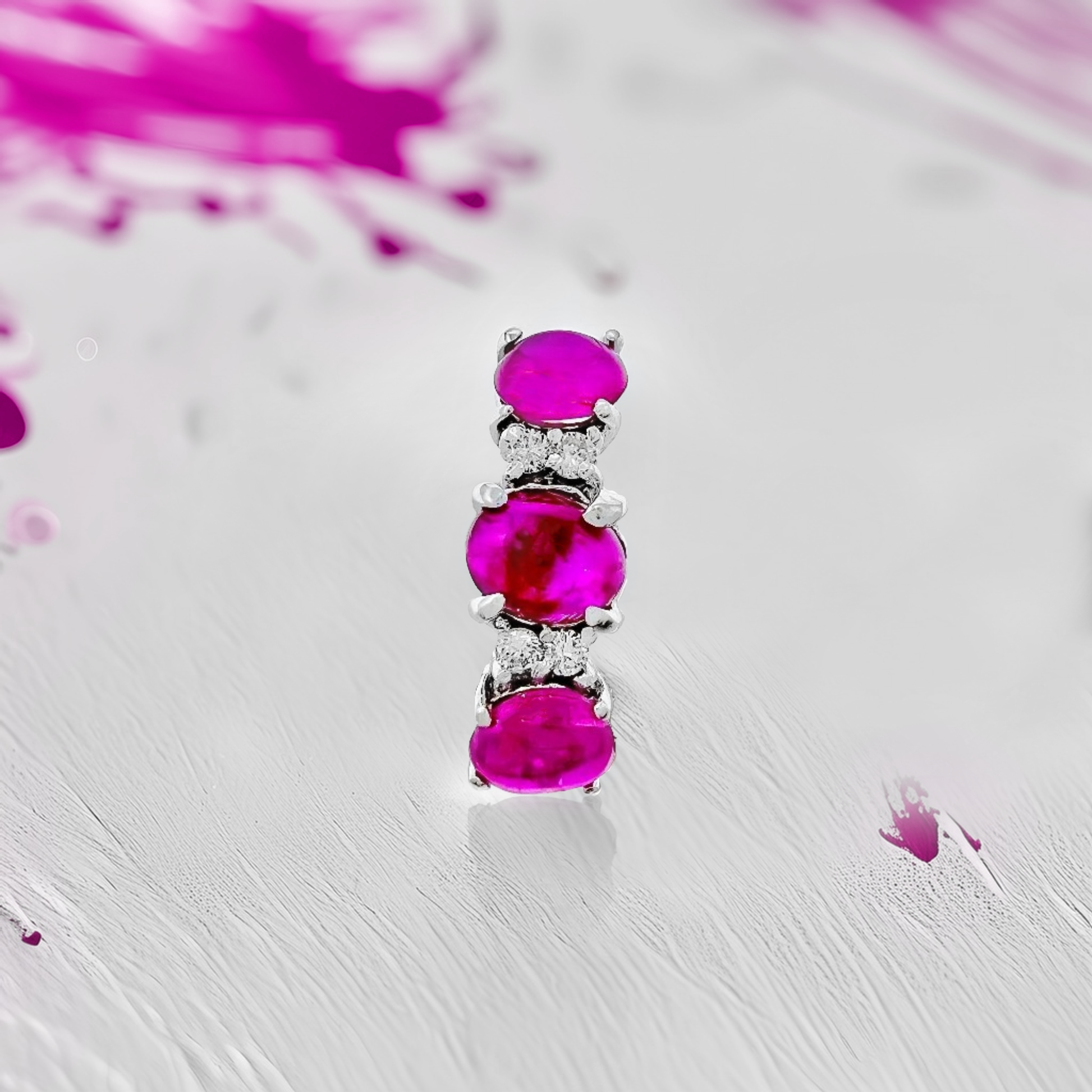 The 3-Stone Cabochon Ruby Diamond Ring brings a quiet, structured elegance—three stones aligned in a way that feels intentional rather than ornamental. The center cabochon ruby carries that familiar dome-like glow, a softened pulse of red that leans toward depth and emotion over brilliance. Oval cabochons often echo a calm, introspective personality—someone who moves with purpose, grounded yet expressive in subtle ways.