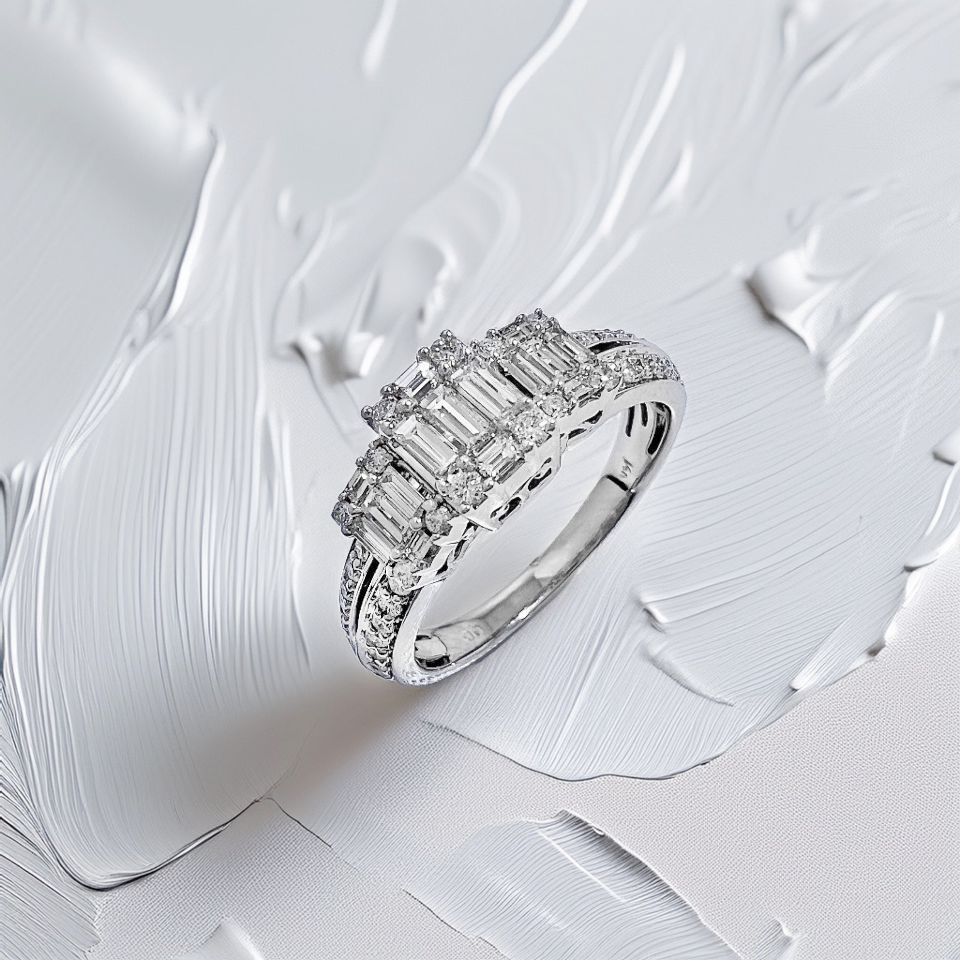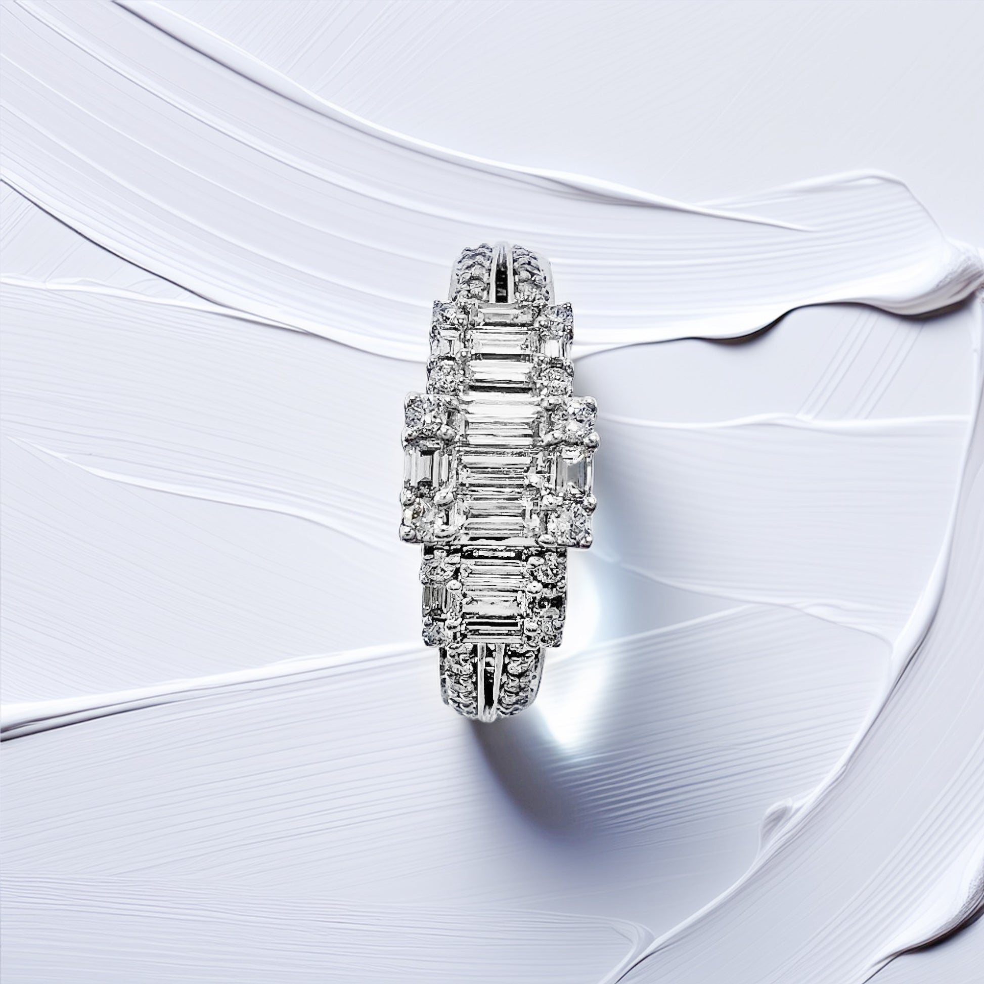 The contrast between the structured baguette look and the classic round sparkle creates a quiet statement: polished, composed, and just a touch bold. It’s the kind of ring that reads as modern in a boardroom, timeless at dinner, and elegantly understated in everyday moments. A piece for someone who wants something different, but still effortlessly sophisticated.
