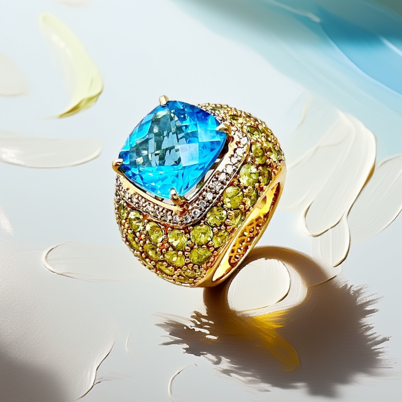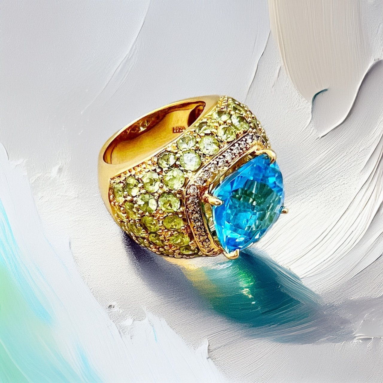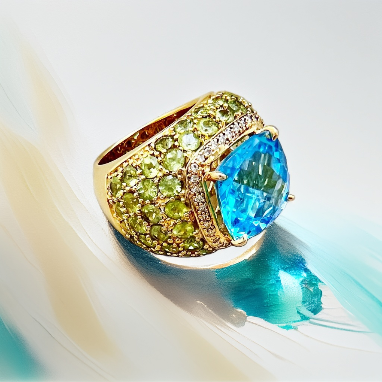 This Blue Topaz And Peridot Cocktail Ring is composed with intention, not excess. At its center, a cushion-cut blue topaz introduces calm authority—structured, balanced, and unmistakably present. The cushion shape suggests stability and composure, while the blue tone carries clarity, depth, and a quiet confidence that never competes for attention.