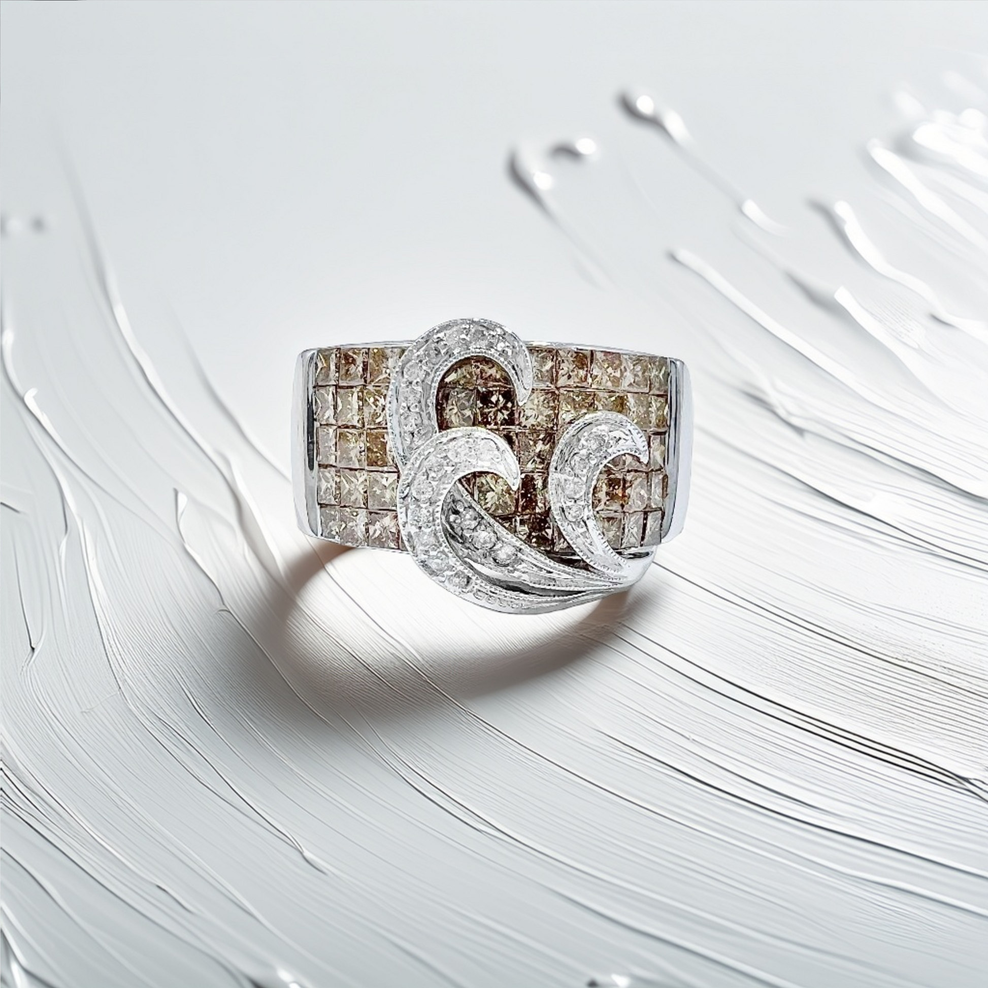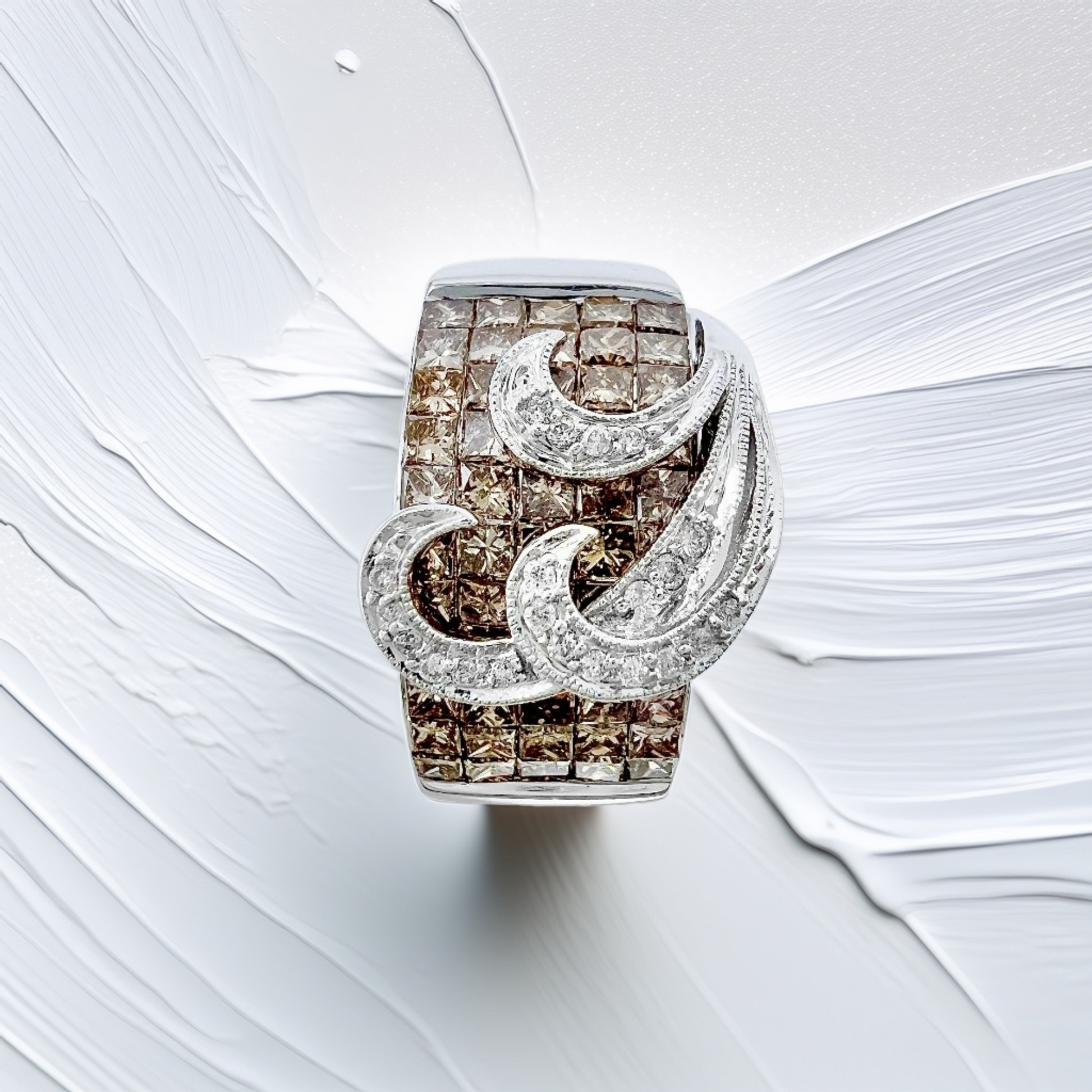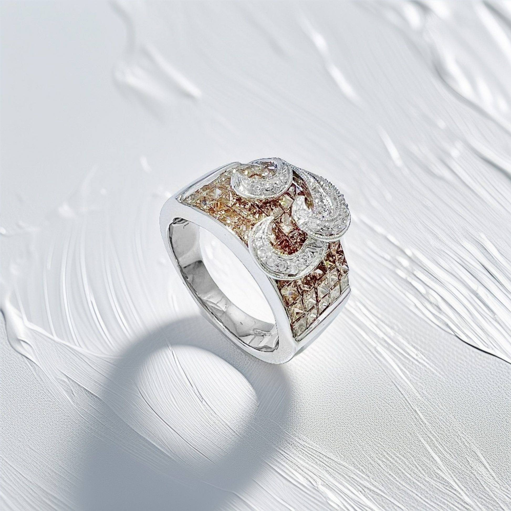 This piece doesn’t whisper; it radiates presence. The Champagne Diamond Floral Cocktail Ring 2.50tcw carries the unapologetic energy of a design built for someone who refuses to blend in. Princess-cut champagne diamonds—each one precise, sharp, and architectural—form a floral silhouette that doesn’t imitate nature, but redefines it. These shapes aren’t casual choices. A princess-cut diamond communicates structure, control, and a mind drawn to clean logic. Paired with the warm champagne tone, the piece projects someone who leads with calm power, not noise.