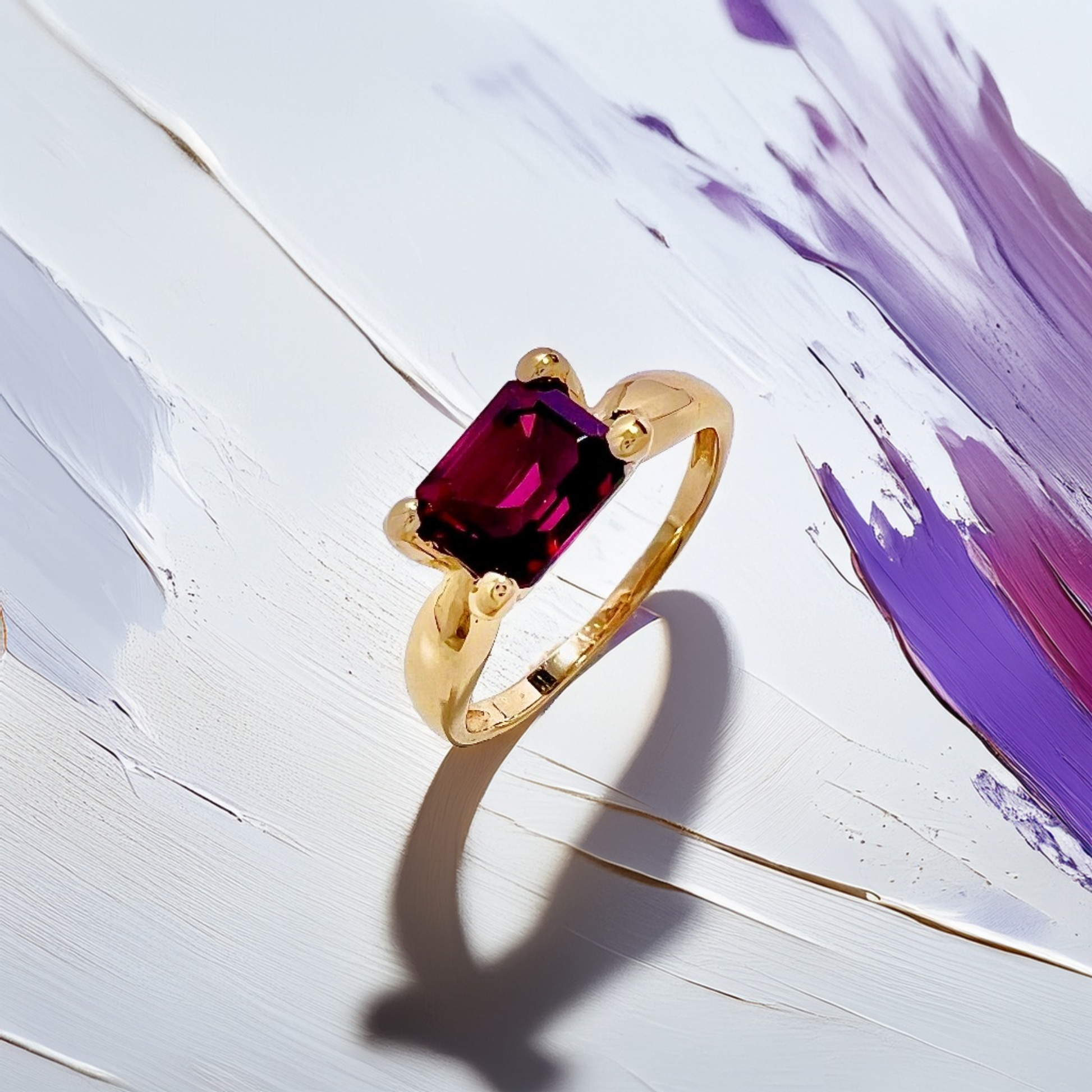 Make a distinctive statement with the East West Emerald Cut Garnet Ring, a piece that beautifully defies tradition. This magnificent 14kt Yellow Gold ring features a vibrant, deep-red Garnet gemstone, custom cut into a sleek, sophisticated Emerald-Cut.