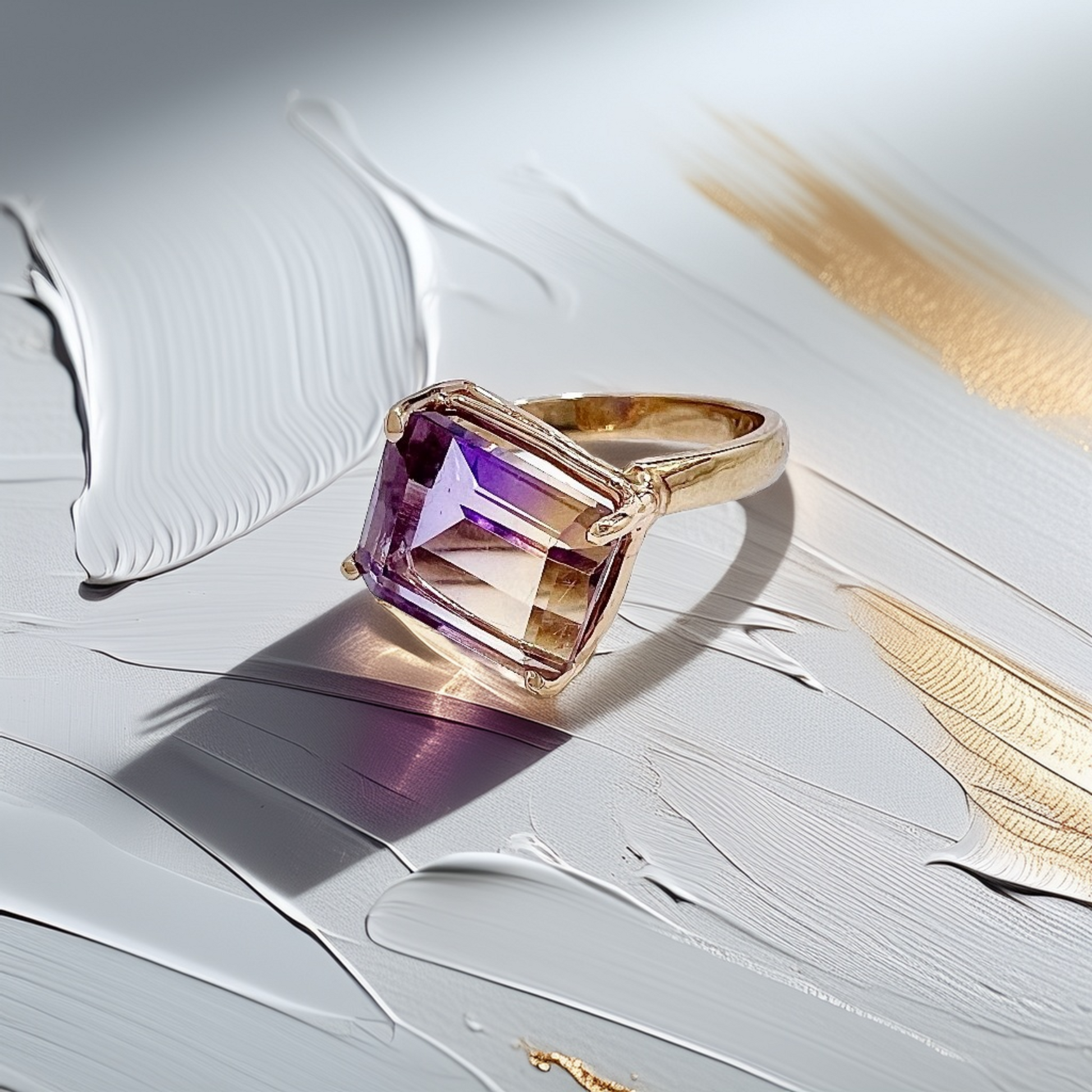 Make a powerful and colorful statement with our magnificent Emerald-Cut Ametrine Ring. This unique piece showcases a genuine, high-impact gemstone renowned for its distinctive natural bi-color zoning. The ametrine masterfully blends the rich violet hues of amethyst with the sunny golden tones of citrine, creating a captivating two-tone effect.