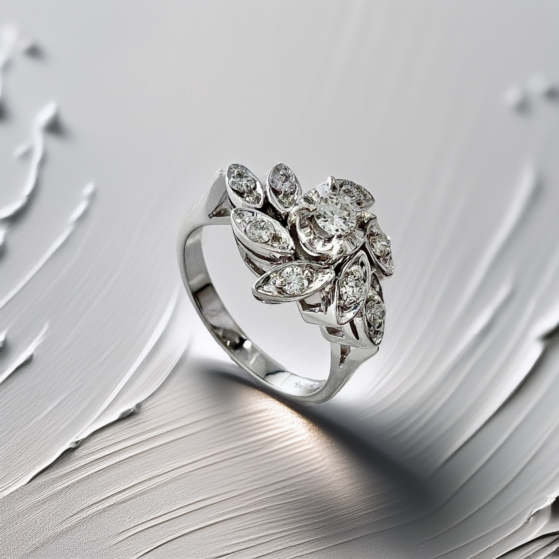 The Floral Inspired Diamond Ring White Gold 0.15tcw draws its character from softness and form. Round-cut diamonds are arranged in a floral composition that feels organic rather than ornate, allowing light to move naturally across the setting. The design suggests growth and continuity—elements shaped by balance, not symmetry alone.