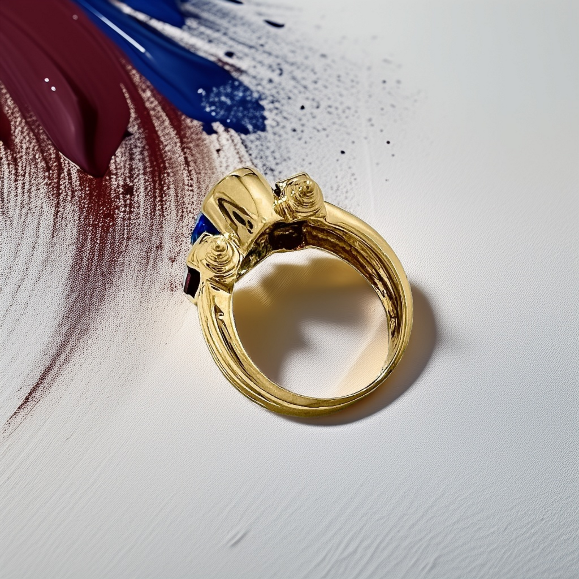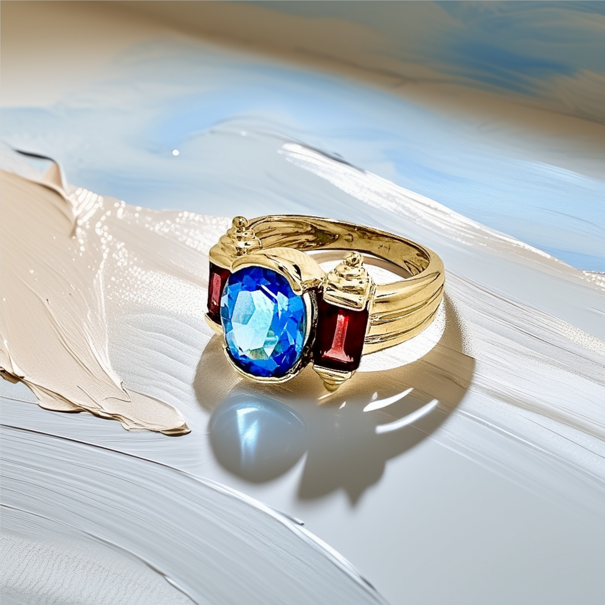 A: This ring combines two powerful birthstones: Garnet (January) symbolizes passion and strength, and Blue Topaz (December) symbolizes lasting love and loyalty. The contrast between the deep red and cool blue is highly prized in modern Statement Rings for its visual drama.