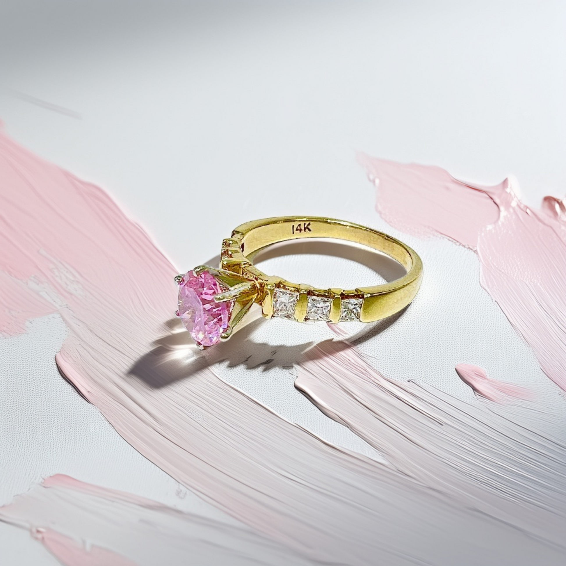 The Pink Quartz & Diamond Engagement Ring balances softness with structure through contrast in color and cut. A round pink quartz center introduces warmth and calm, while princess-cut diamonds add definition through clean, angular lines. Set in 14kt yellow gold with white-gold accents, the composition feels intentional—romantic without fragility, expressive without excess.