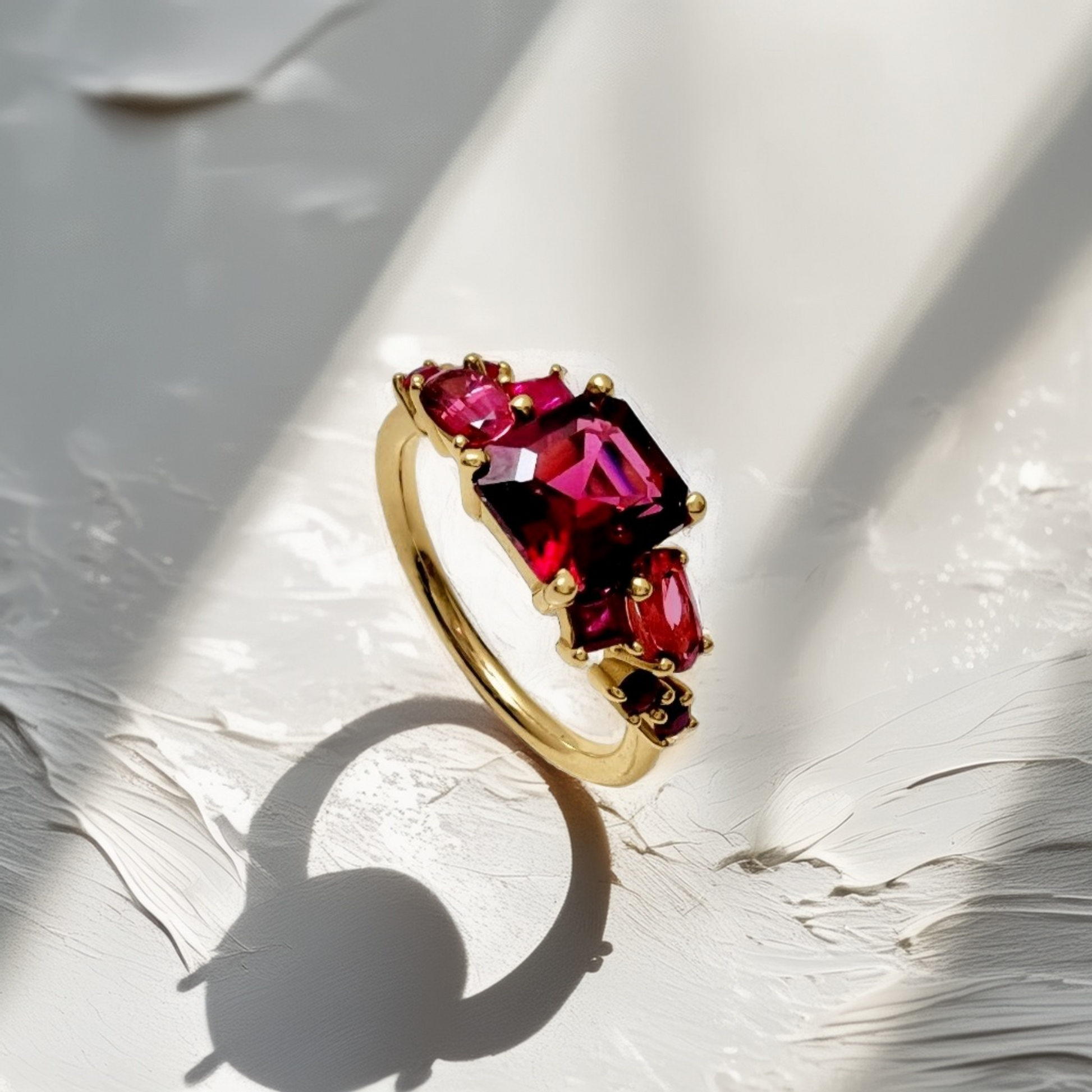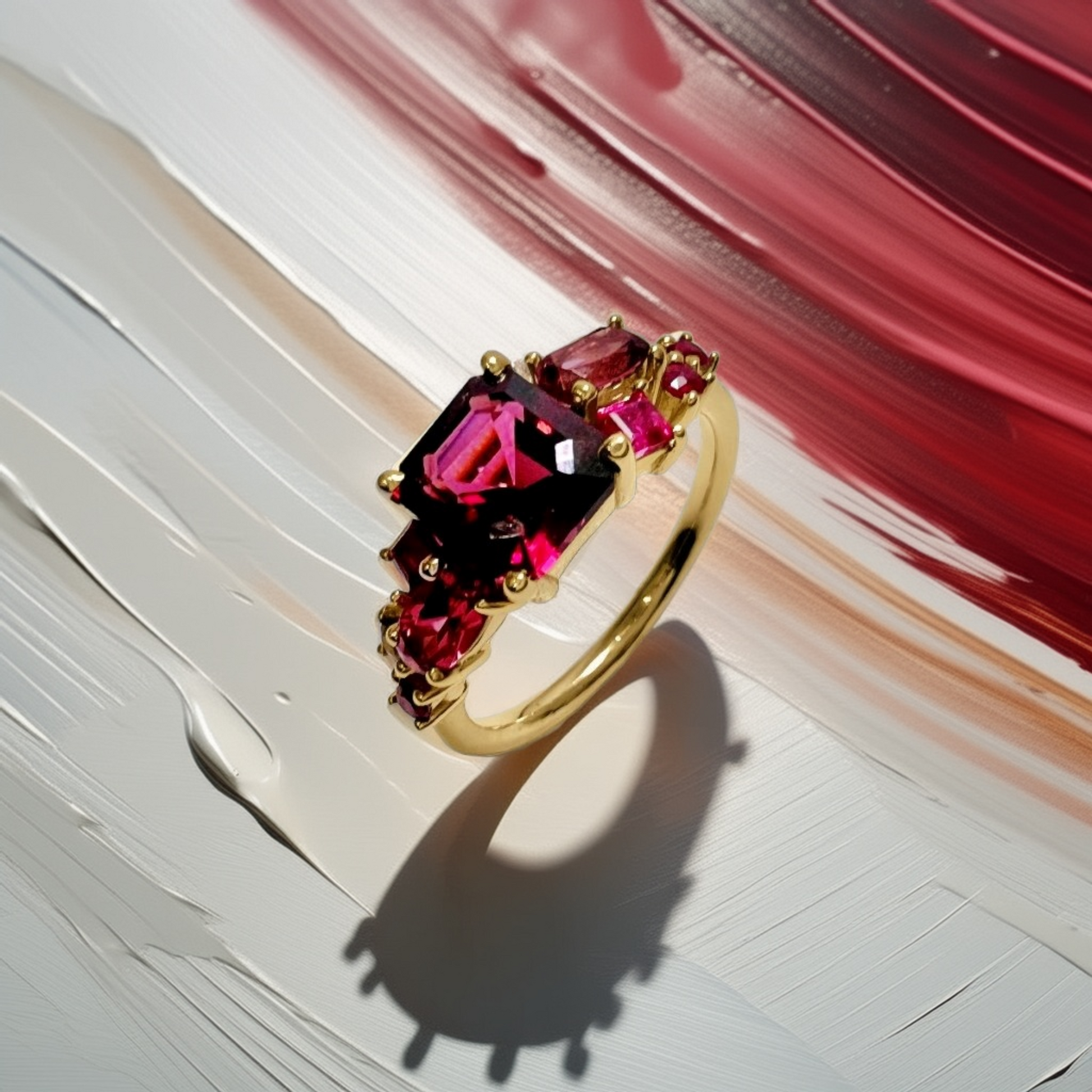 The Garnet Ring is defined by structure, depth, and restraint. At its center, an Asscher-cut garnet reveals layered reds that feel architectural rather than ornamental—precise lines, deliberate symmetry, and a presence that holds attention quietly. This cut has long been associated with clarity of character and confidence rooted in self-awareness.