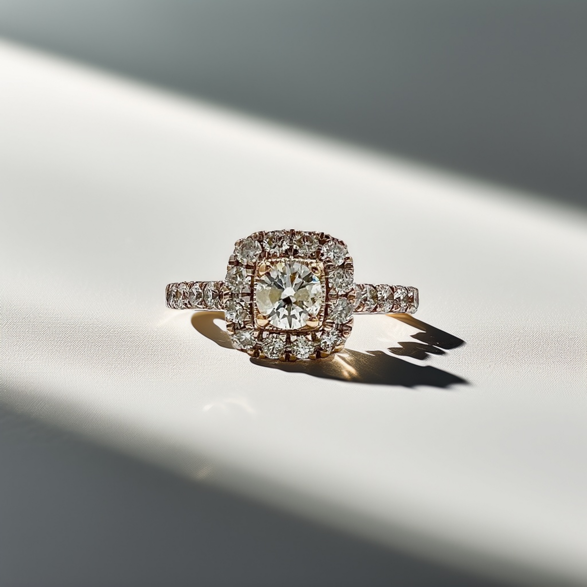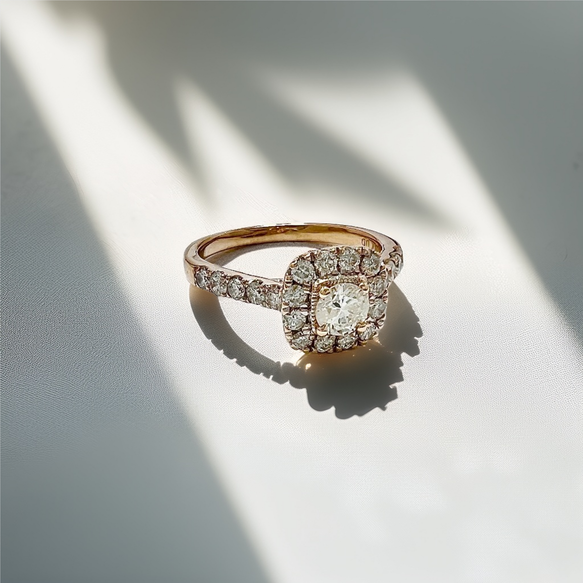 The circular halo and round center lean into symmetry and continuity—an aesthetic that quietly signals loyalty, stability, and long-term thinking. The slender 2.00mm band keeps the profile elegant, allowing the eye to stay on the face of the ring, ideal for someone who prefers polish and structure over excess. G/H color diamonds with SI2/I1 clarity offer an appealing mix of radiance and real-life wearability, suited to a lifestyle that values beauty with practicality.