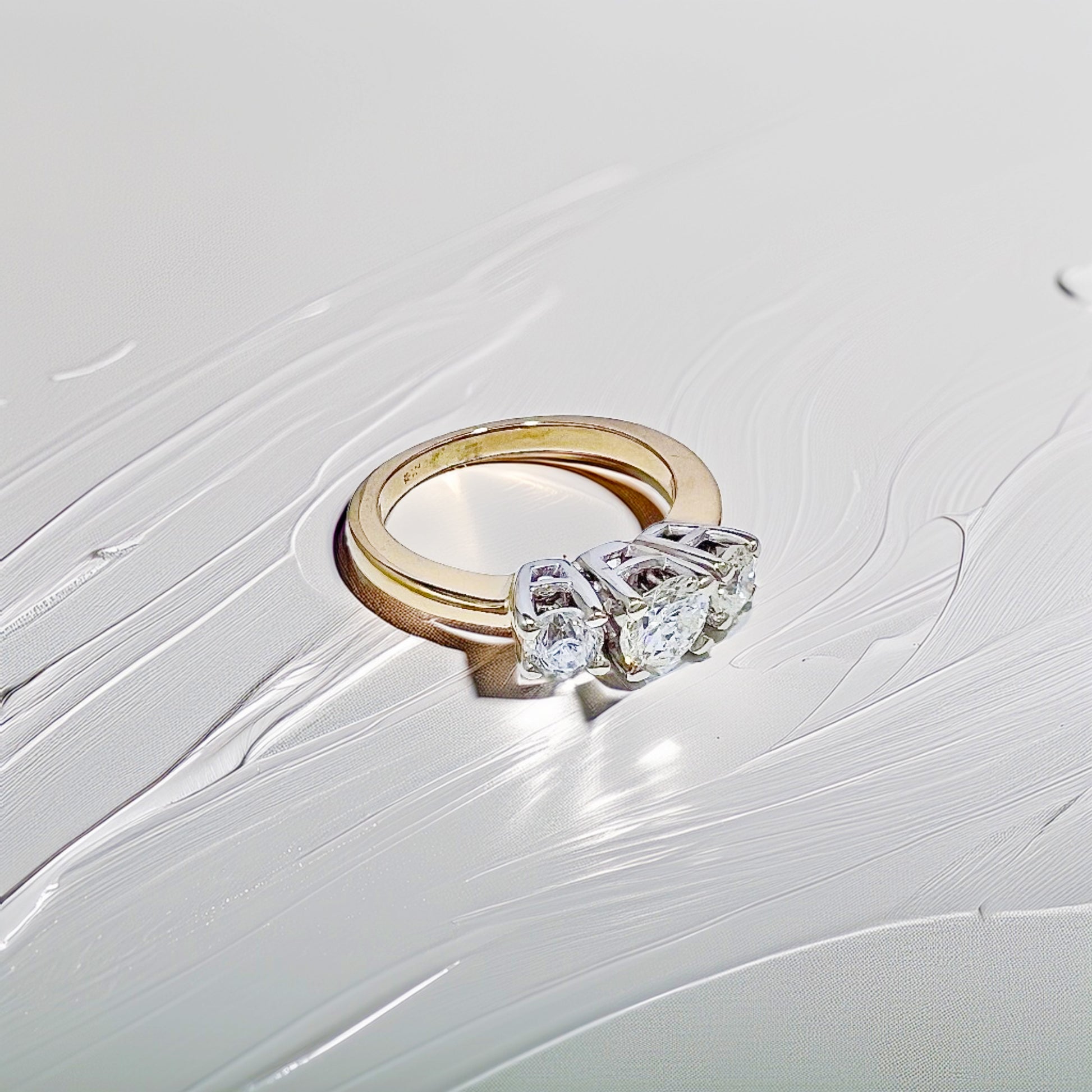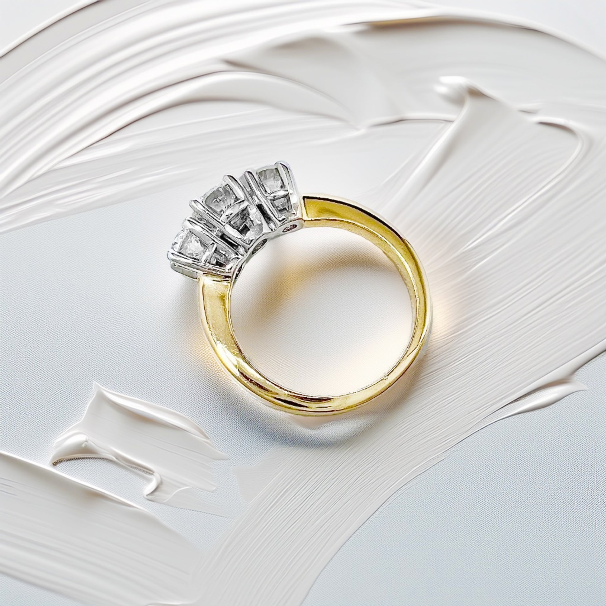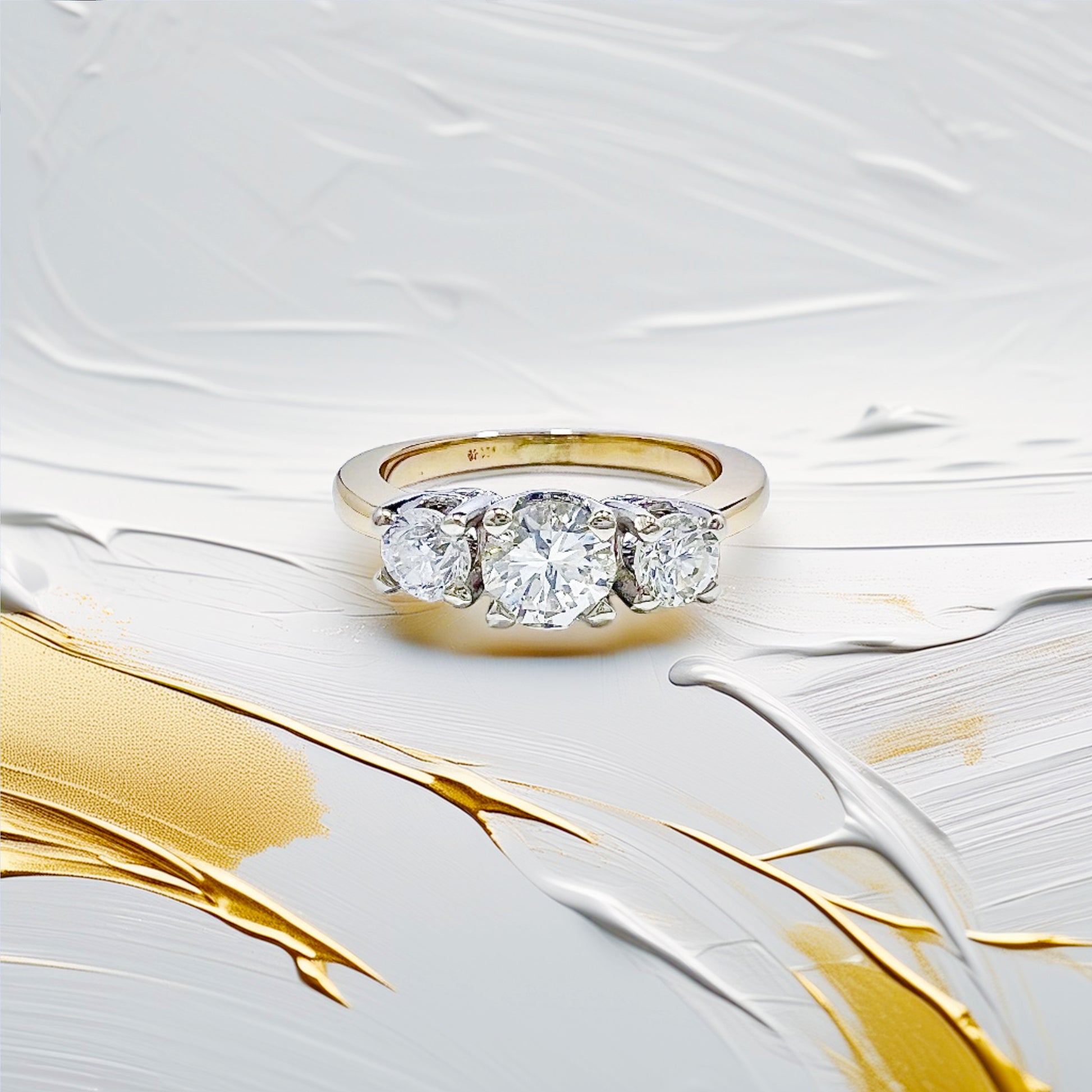 This is the kind of three-stone engagement ring chosen by someone who values symbolism as much as style: past, present, and future captured in a balanced, modern, two-tone design that doesn’t shout, but never blends in.