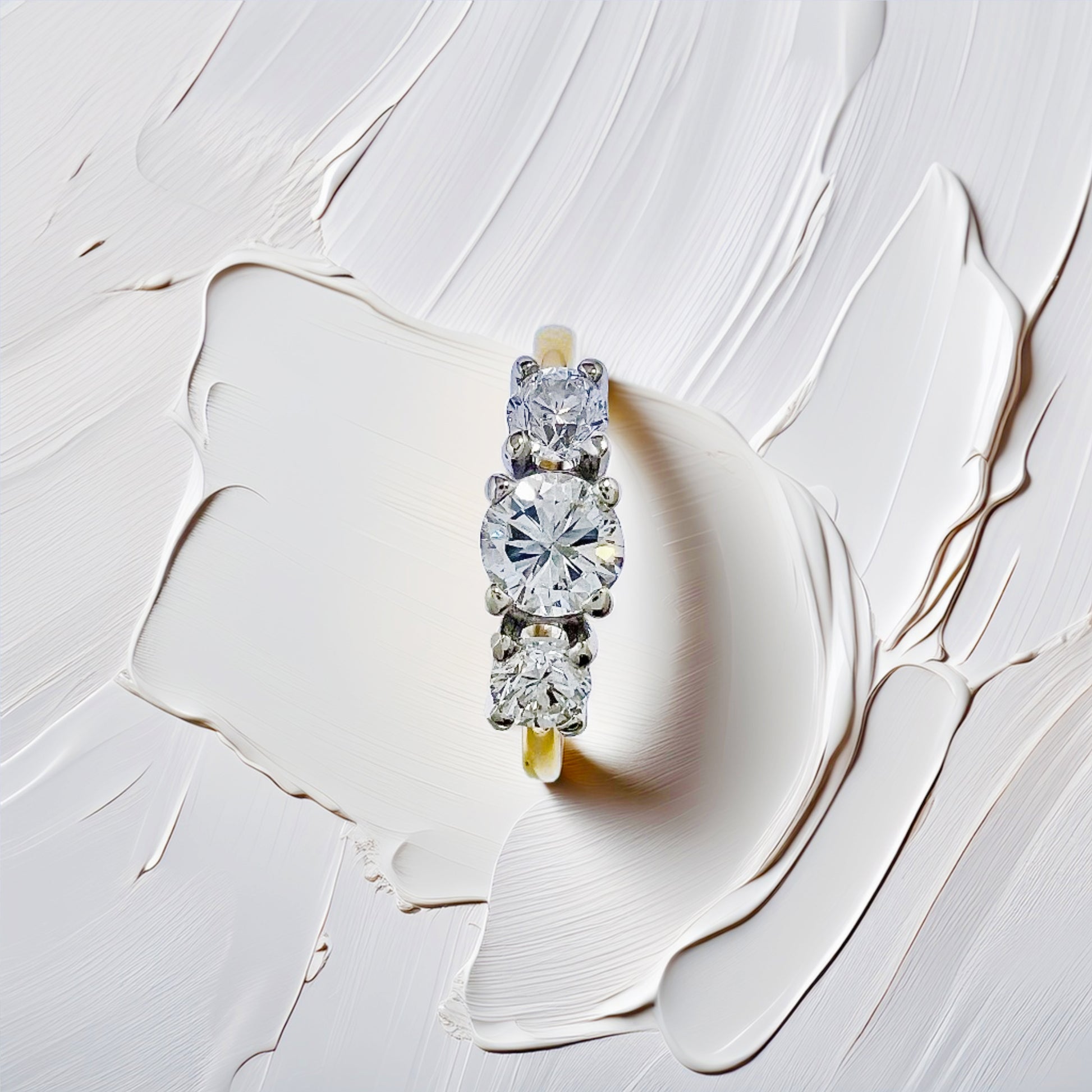 A trio of round natural diamonds sits in a clean prong setting, quietly stating what matters most: commitment, continuity, and a future that’s already in motion. The three stones total 0.85tcw in G/H color and SI1/SI2 quality, giving off a bright, confident sparkle without looking overdone.