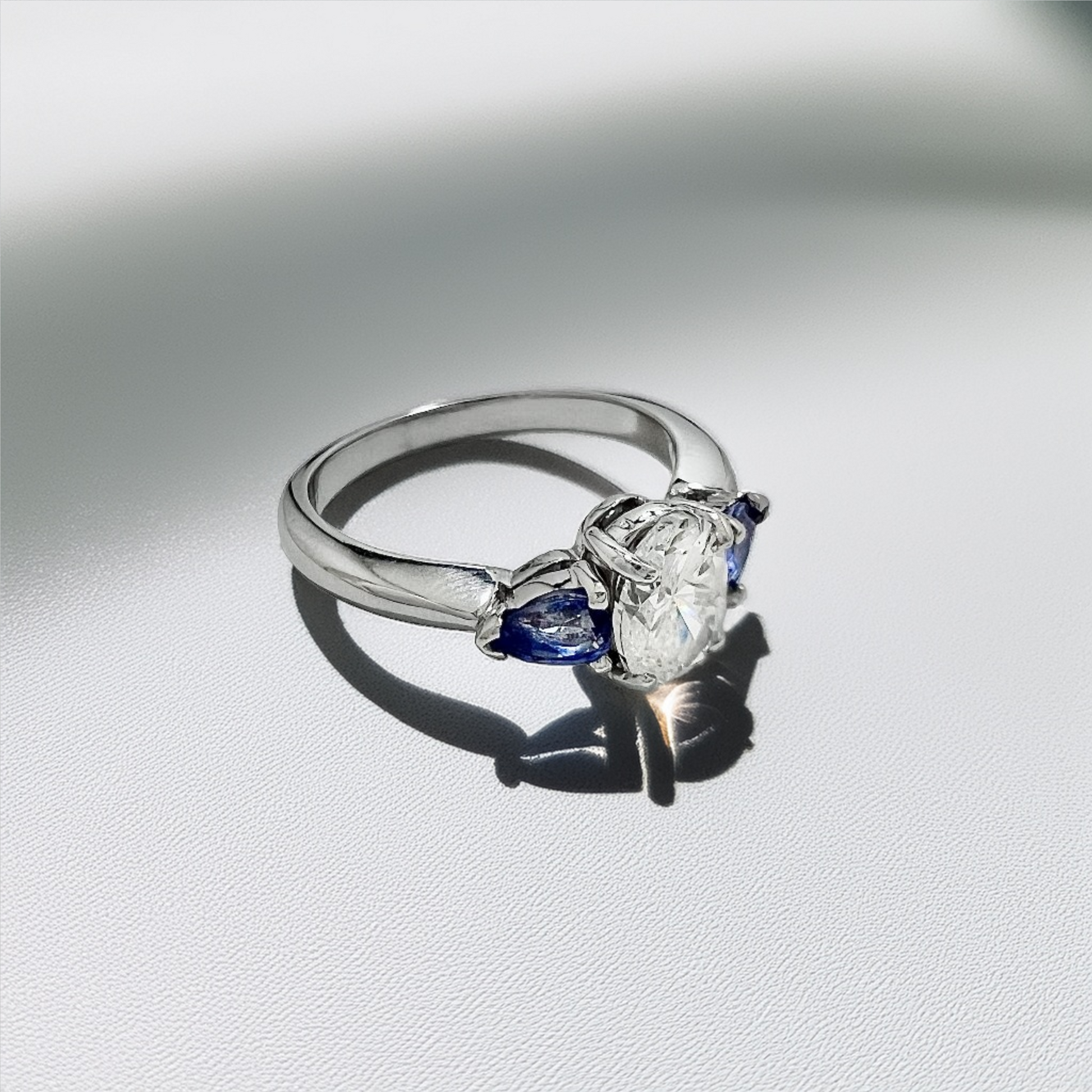 An oval diamond takes center stage, elongated and quietly confident, framed by two pear-shape sapphires that lean in like loyal companions. The effect is intentional: a ring that signals commitment with subtle strength rather than noise, balancing grace with presence on the hand.