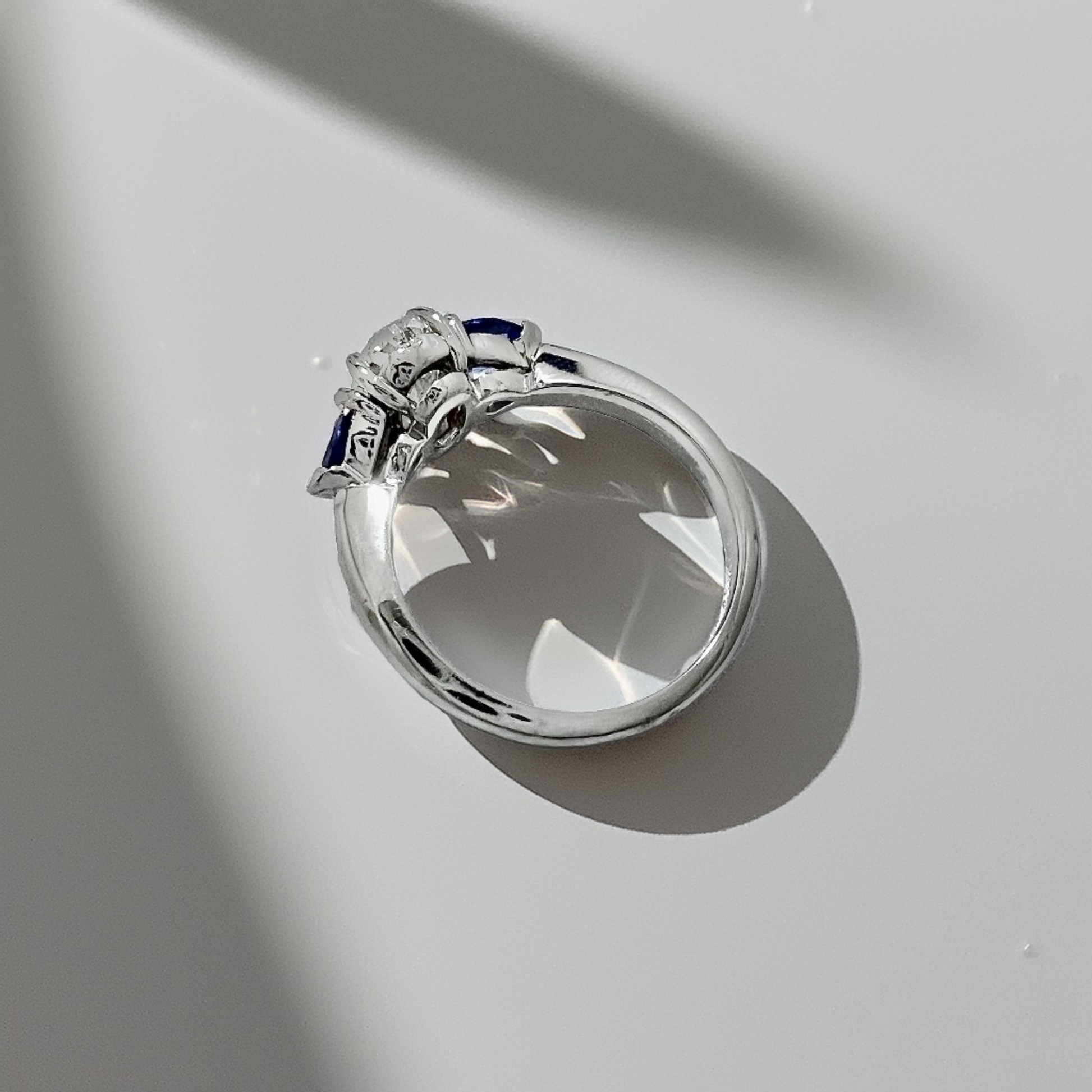 Set in solid platinum, this three-stone design features a 1.16ct natural oval diamond in H/I color and SI/I1 clarity, bringing a soft, luminous sparkle instead of harsh brilliance. The pear sapphires (0.54ct total) introduce a deep, refined contrast, adding character and depth to the classic engagement silhouette. Nothing feels excessive; everything feels considered.