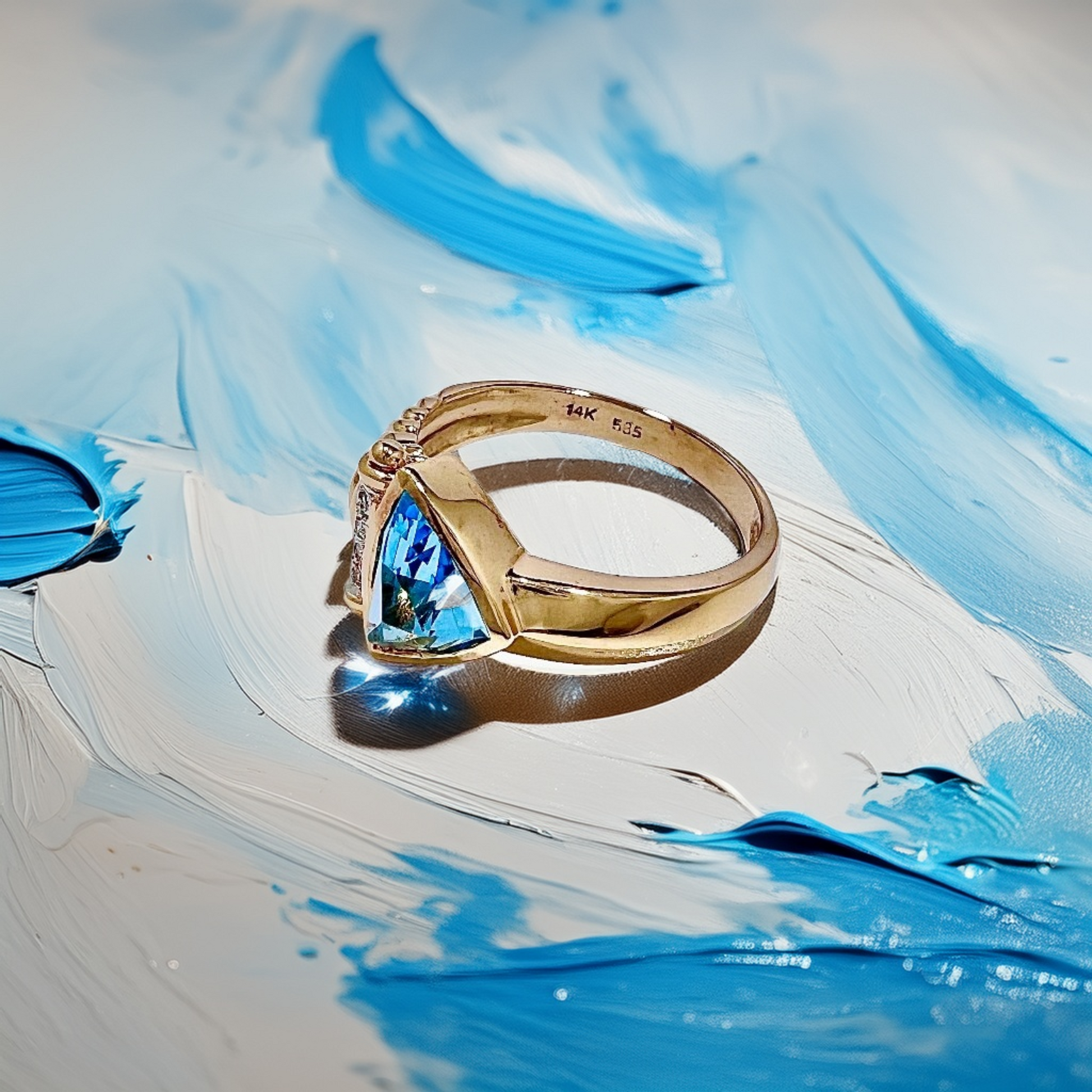 Discover the stunning geometric elegance of the Trillion-Cut Blue Topaz Diamond Ring. This unique piece features a vibrant Blue Topaz gemstone, perfectly cut into a brilliant Trillion-Cut (triangular shape) to maximize its fire and color.