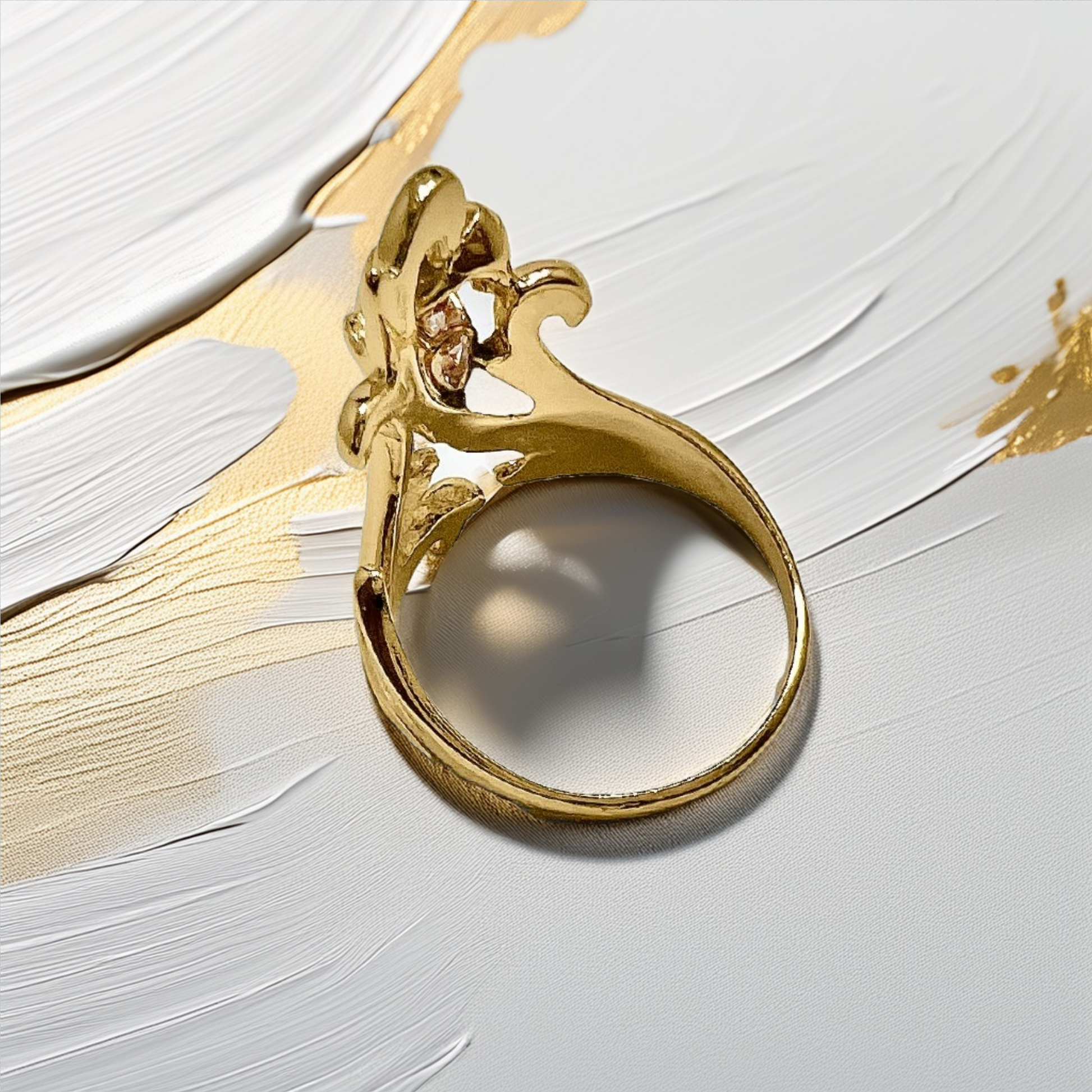 A: The Vintage style comes from the intricate Handmade Setting in the 14kt Yellow Gold, evoking classic heirloom artistry. The 23.30mm Length is exceptionally long, designed to provide dramatic, unique finger coverage and make a bold statement.